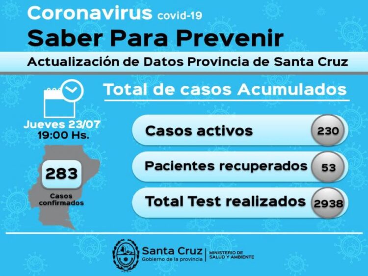 El Ministerio de Salud y Ambiente informa que la provincia de Santa Cruz registra un total de 283 casos positivos a coronavirus, de los cuales 53 negativizaron al virus y 230 se encuentran activos en la provincia.