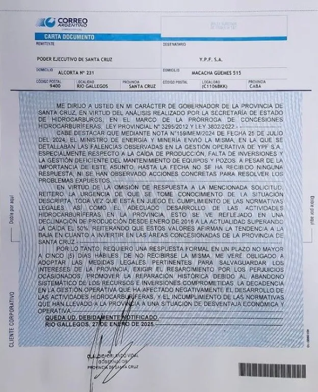 En una carta documento dirigida a YPF S.A., el gobernador de la provincia de Santa Cruz, Claudio Vidal, ha solicitado una respuesta urgente ante la caída dramática en la producción hidrocarburífera de la región.