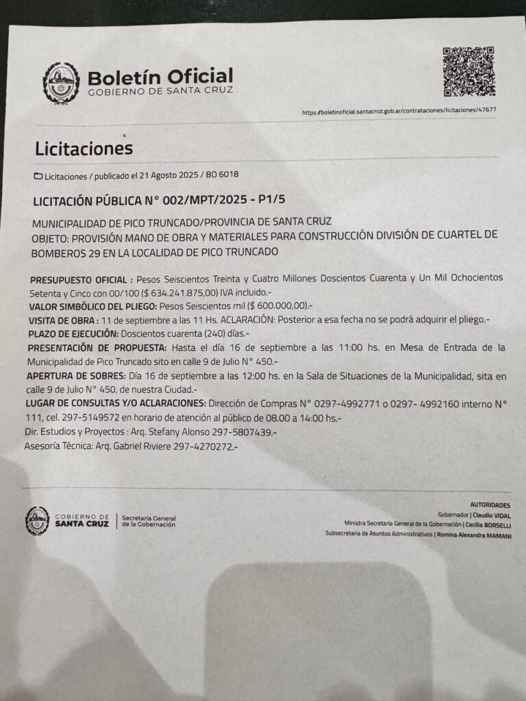 La Municipalidad de Pico Truncado llama a Licitación Pública para la construcción de la División Cuartel de Bomberos 29 en la ciudad de Pico Truncado con un presupuesto oficial de $ 634.000.241.800,75 con 00/100 IVA incluido