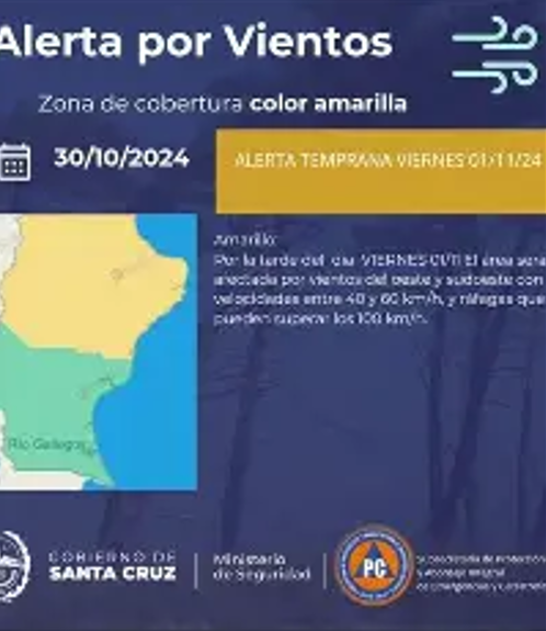 Además, se prevé una advertencia de nivel naranja para las costas de Deseado, Magallanes, Corpen Aike y Güer Aike, así como las mesetas de Corpen Aike, Güer Aike y Lago Argentino. Estas zonas sufrirán vientos del sector oeste entre 65 y 80 km/h, con ráfagas muy intensas que podrían superar los 110 km/h. No se descarta reducción de la visibilidad por polvo levantado por el viento.